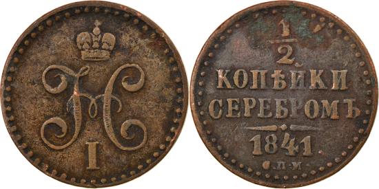 | | Coin, Russia, Nicholas I, 1/2 Kopek, 1841, Saint-Petersburg, , Copper | | | Crowned monogram, Value, date | | FEATURES |