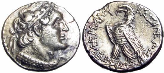 Ptolemaic Kingdom of Egypt, Ptolemy VI AR Didrachm. Uncertain mint in Cyprus(?), dated year 105 of an uncertain era (158/7 BC). Diademed head of Ptolemy I right, wearing aegis / Eagle standing left on thunderbolt, PE (date) on thunderbolt; ΠTOΛEMAIOY BAΣIΛEΩΣ around. Svoronos 1212; SNG Copenhagen 552; DCA 76. 6.79g, 21mm, 1h. gVF. Rare. |