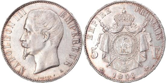 | | Coin, France, Napoleon III, Napoléon III, 5 Francs, 1856, Paris, | | | Napoléon III, Head left, Crowned and mantled arms divide denomination, NAPOLEON III EMPEREUR | | FEATURES |