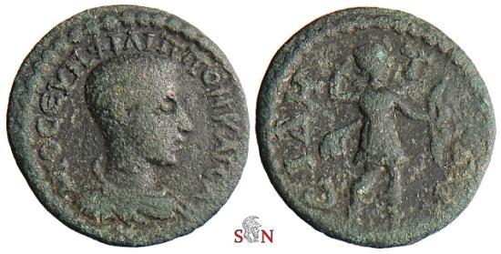 Philippus II. Ae 18 mm, Pamphylia, Side, struck AD 244-247. Obv: Μ ΙΟ ϹƐΥΗ ΦΙΛΙΠΠΟΝ ΚΑΙϹΑ, draped bust right. Rev: ϹΙΔΗΤΩΝ, Artemis advancing r., drawing arrow from quiver at shoulder and holding bow. 3,10 g, 18 mm. RPC - (online ID 21166), SNG Leypold 1909. dark green patina, slightly porous very rare |
