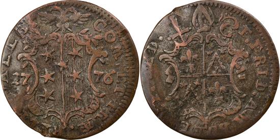 | | Coin, SWISS CANTONS, SITTEN, Batzen, 1776, Bern, , Billon, KM:34 | | | Mitre above ornate 4-fold arms, Small double-headed eagle above shield with stars within that divides date | | FEATURES |