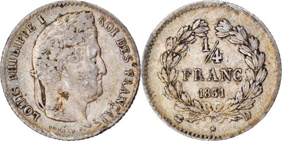 | | Coin, France, Louis-Philippe, 1/4 Franc, 1831, Lyon, , Silver | | | Louis-Philippe, Laureate head right, Denomination within wreath | | FEATURES |