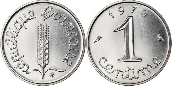 | | Coin, France, Épi, Centime, 1973, Paris, FDC, , Stainless Steel | | | Épi, Cursive legend surrounds grain sprig, Cursive denomination, date at top, 1991-1993 dated coins, non-Proof, exist in both coin and medal alignment. Values given here are for medal alignment examples. Pieces struck in coin alignment have been traded for as much as $50.00. | | FEATURES |