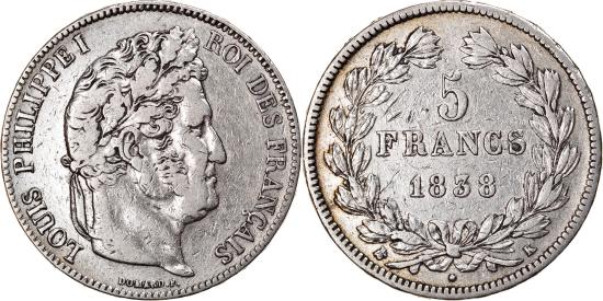 | | Coin, France, Louis-Philippe, 5 Francs, 1838, Bordeaux, , Silver | | | Louis-Philippe, Laureate head right, Mint marks at edge outside wreath | | FEATURES |