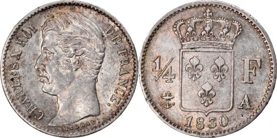 | | Coin, France, Charles X, 1/4 Franc, 1830, Paris, , Silver, KM:722.1 | | | Charles X, Head left, Crowned arms divide denomination, CHARLES X ROI DE FRANCE | | FEATURES |