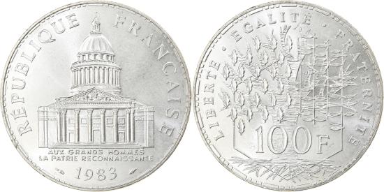 | | Coin, France, Panthéon, 100 Francs, 1983, Paris, , Silver, KM:951.1 | | | Panthéon, Pantheon, date below, Leafy design above denomination, Without mint mark. | | FEATURES |