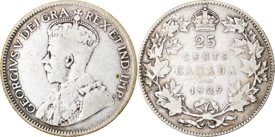 | | Coin, Canada, George V, 25 Cents, 1929, Royal Canadian Mint, Ottawa, | | | Crowned bust left, Denomination and date within wreath, crown below, E. B. MacKennal | | FEATURES |