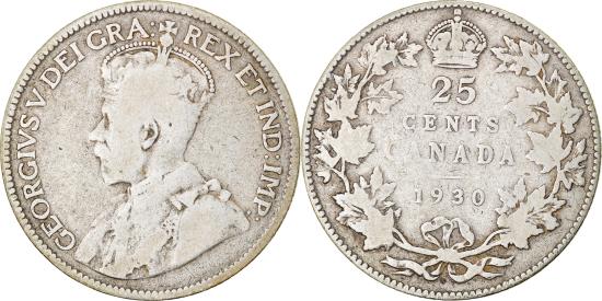 | | Coin, Canada, George V, 25 Cents, 1930, Royal Canadian Mint, Ottawa, | | | Crowned bust left, Denomination and date within wreath, crown below, E. B. MacKennal | | FEATURES |