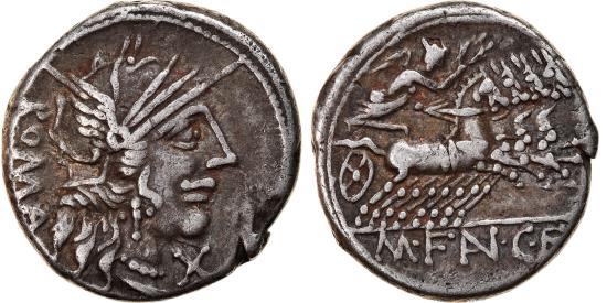 | | Coin, Fannia, Denarius, Rome, , Silver, Crawford:275/1 | | | M. Fannius, Fannia, Denarius, Rome, 123 BC, Silver, Crawford:275/1, Helmeted head of Roma right; ROMA behind, X (mark of value) below chin, Victory driving galloping quadriga right, holding reins and wreath, ROMA, M. FAN. C. F. | | FEATURES |