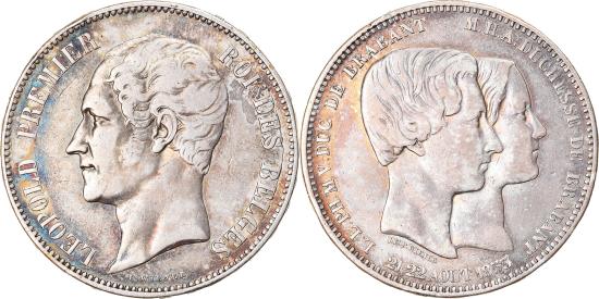 | | Coin, Belgium, Leopold I, 5 Francs, 1853, , Silver, KM:2.1 | | | Head left, Conjoined heads right; date: 21-22 AOUT 1853, Prev. KM#M8.1., LEOPOLD PREMIER ROI DES BELGES | | FEATURES |