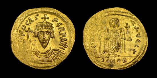 Phocas (AD 602-610) Gold Solidus Constantinople mint Obverse: Draped and cuirassed facing bust, wearing crown without pendilia and holding globus cruciger; AN FOCAS PERP AV Reverse: Angel standing facing, holding long staff surmounted by staurogram and globus cruciger; VICTORIA AVGG Z, CONOB in exergue. 4.6 grams, 21 mm in diameter. Toned, a lustrous extremely fine, with a pleasing portrait. |