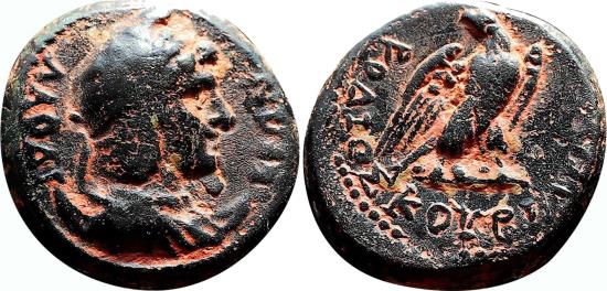Obverse: ΛΑΟΔΙΚΕΩΝ. Laureate and draped bust of Mên right, wearing Phrygian cap and set upon crescent. Reverse: KOP ΔΙΟΣΚOΥΡΙΔΗΣ. Eagle standing right, head left; monogram to left. Good exemplar of this uncommon issue, in VF+/EF- condition, conserving complete details in both sides. Besides the coin looks better in hand than in the photo. RPC I 2907. Laodicea ad Lycum mint, AD 14-37. 5,3 g - 16 mm -------------------------------------------------------------------------------------------------- Visit our site about Numismatics and Archaeology: aeternitas-numismatics.com |