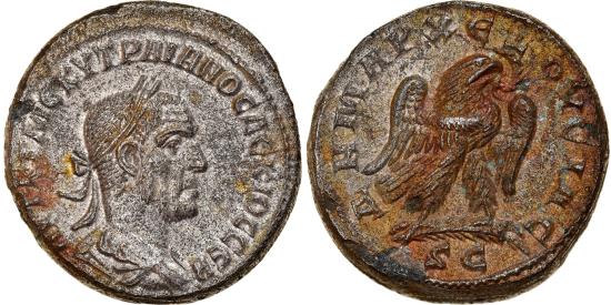 | | Coin, Seleucis and Pieria, Trajan Decius, Tetradrachm, 251, Antioch, | | | ΑΥΤ Κ Γ ΜЄ ΚΥ ΤΡΑΙΑΝΟϹ ΔЄΚΙΟϹ ϹЄΒ, laureate, draped and cuirassed bust to right, seen from behind; •• below bust., ΔHMAPX ЄΞOYCIAC, eagle standing to right on palm, with wreath in beak and wings spread; SC in exergue. | | FEATURES |