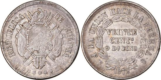 | | Coin, Bolivia, 20 Centavos, 1872, Potosi, , Silver, KM:159.1 | | | Crossed flags and weapons behind condor-topped oval arms, stars below, Denomination within wreath, Mint mark in monogram., REPUBLICA BOLIVIANA | | FEATURES |