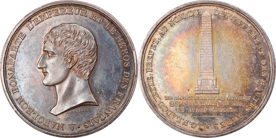 | | France, Medal, Napoleon Bonaparte, Opening of Mont Genevre, 1804, Silver | | | Bare head of Napoleon Bonaparte on the left., Montgenèvre obelisk., Medal struck shortly before Napoleon Bonaparte's coronation as first Emperor of the French. It commemorates the opening of the Mont Genèvre road and the inauguration of the obelisk dedicated to Napoleon and unveiled on April 12, 1804. Despite a few light marks on both sides, it features an iridescent patina, particularly on the reverse, and a splendid portrait of Napoleon Bonaparte. A very rare medal!, A NAPOLEON BONAPARTE L'EMPEREUR ET LE HEROS DES FRANCAIS·, J. G. F. LADOUCETTE, PREFET, AU NOM DU DEPARTEMENT DES HAUTES ALPES* // LE MONT GENEVRE OUVERT 22 GERMINAL AN XII 12 AVRIL MDCCCIV . | | FEATURES |