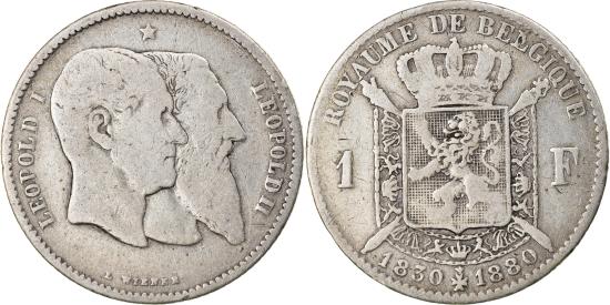 | | Coin, Belgium, Leopold II, Franc, 1880, , Silver, KM:38 | | | Jugate heads of Leopold I and Leopold II right, Crowned arms on ornate shield divide denomination, LEOPOLD ILEOPOLD II | | FEATURES |