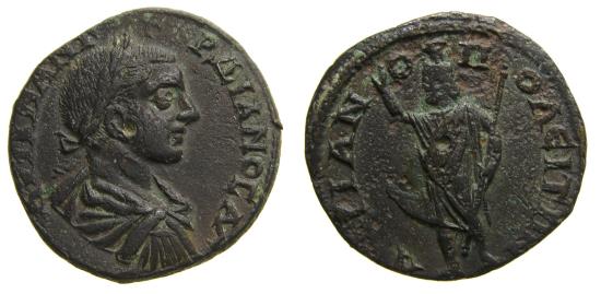 Rev: Serapis standing left, raising right hand, holding sceptre.