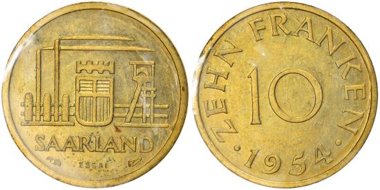 | | Coin, SAARLAND, 10 Franken, 1954, Paris, ESSAI, , Aluminum-Bronze | | | KM1. | | FEATURES |