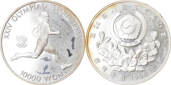 | | Coin, KOREA-SOUTH, 10000 Won, 1988, Seoul, , Silver, KM:74 | | | Arms above floral spray, Gymnast | | FEATURES |