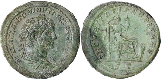 | | Caracalla, Sestertius, 214-217, Rome, Bronze, , RIC:573A | | | Bust of Caracalla, laureate, draped, cuirassed, right., Securitas, draped, seated right on low seat, propping head on right hand and holding sceptre in left hand; in front, altar., Splendid specimen of a sestertius struck during the reign of Caracalla. With an extremely rare type, this specimen is even more exceptional for its state of preservation, which is rarely seen on these bronze coins, making it one of the finest specimens seen in sales and available to private collectors, if not the finest for this type. The flan was fragile when it was struck, with a crack in the flan at the level of the portrait's eyes. This portrait of Caracalla conveys power, severity and seriousness in its engraving, depicted in imperial attire with the drapery, and military uniform with his cuirass. A true masterpiece in the representation of the emperor's features, which has reached us in this superb condition. Finally, this sestertius has a delicate green patina that is particularly attractive to the eye. Ex NAC Auction 84, 2015, lot 1076., M AVREL ANTONINVS PIVS AVG GERM, SECVRITATI PERPETVAE // S C | | FEATURES |