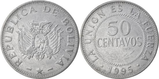 | | Coin, Bolivia, 50 Centavos, 1995, , Stainless Steel, KM:204 | | | National arms, star below, Denomination within circle, date below, REPUBLICA DE BOLIVIA | | FEATURES |
