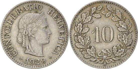 | | Coin, Switzerland, 10 Rappen, 1929, Bern, , Copper-nickel, KM:27 | | | Crowned head right, Value within wreath, CONFOEDERATIO HELVETICA Karl Schwenzer | | FEATURES |