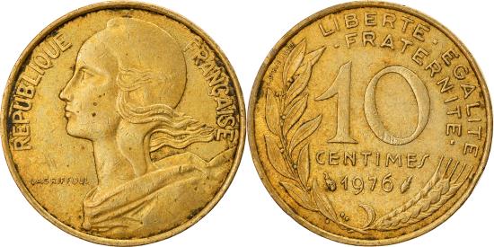 | | Coin, France, Marianne, 10 Centimes, 1976, Paris, , Aluminum-Bronze | | | Marianne, Liberty bust left, Denomination above date, grain sprig below, laurel branch at left, Without mint mark. 1991-1993 dated coins, non-Proof, exist in both coin and medal alignment., Henri Lagriffoul | | FEATURES |
