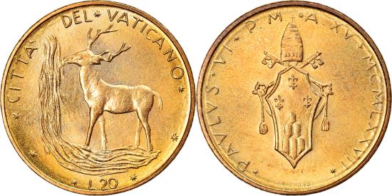 | | Coin, VATICAN CITY, Paul VI, 20 Lire, 1977, Roma, , Aluminum-Bronze | | | Crowned shield, Red deer | | FEATURES |