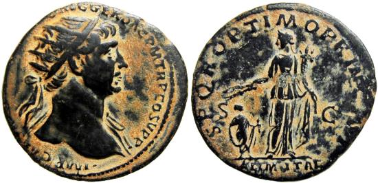 Trajan Dupondius. 103-111 AD. (12.09 gm), IMP CAES NERVAE TRAIANO AVG GER DAC PM TRP COS V P P, radiate lead right, slight drapery on left shoulder / SPQR OPTIMO PRINCIPI, Abundantia standing left, holding corn ears and cornucopiae, at her feet, a child standing right, holding a roll. S-C across fields, ALIM ITAL below. Woytek 355a1. RIC 460 var (bust type).gVF, Natual patina. |