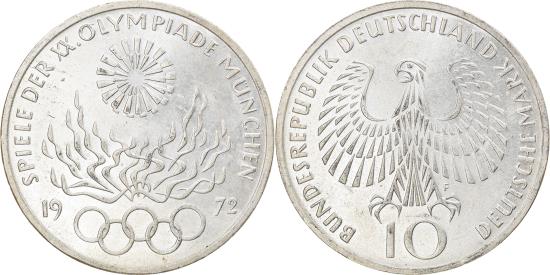 | | Coin, GERMANY - FEDERAL REPUBLIC, 10 Mark, 1972, Stuttgart, , Silver | | | Eagle above denomination, Olympic Flame, spiral symbol above, rings divide date below | | FEATURES |