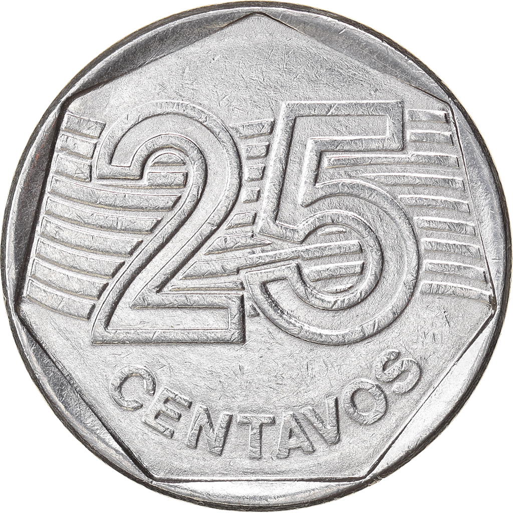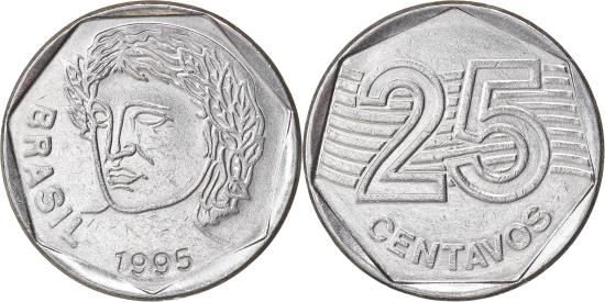 | | #[897104] COIN, BRAZIL, 25 CENTAVOS, 1995, , STAINLESS STEEL, KM:634 | | | Stylized laureate liberty head left, date below | | Outlined denomination, linear design | | CHARACTERISTICS |