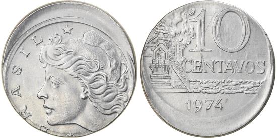 Coin, Brazil, 10 Centavos, 1974, error off center strike, , StainlessCoin, Brazil, 10 Centavos, 1974, error off center strike, , Stainless