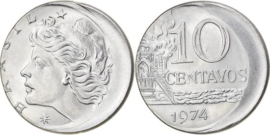 | | Coin, Brazil, 10 Centavos, 1974, error off center strike, , Stainless | | | Liberty head left, Oil refinery, denomination and date at right | | FEATURES |