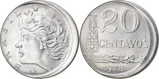 | | Coin, Brazil, 20 Centavos, 1978, error off center strike, , Stainless | | | Liberty head left, Denomination above date, oil derrick at left | | FEATURES |