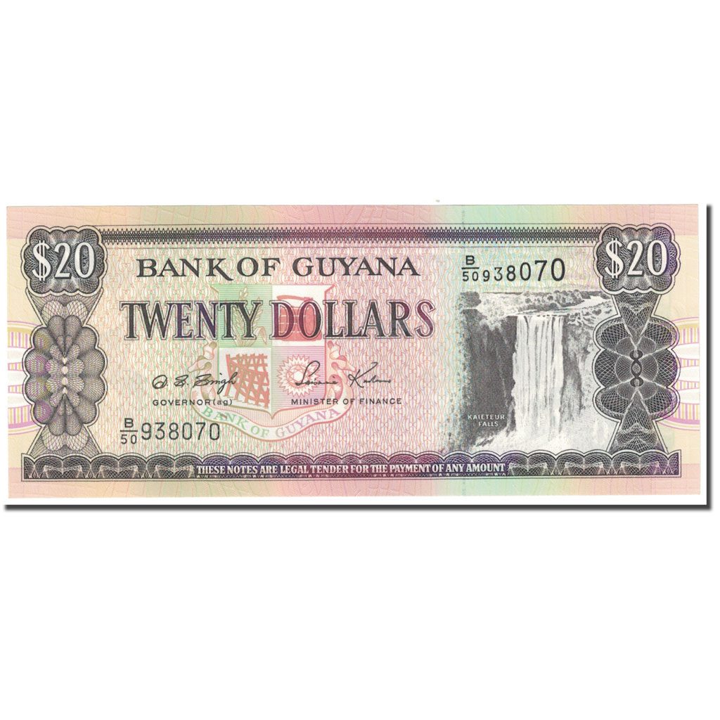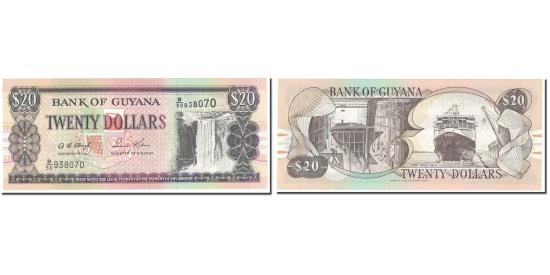 | | #[608870] BANKNOTE, GUYANA, 20 DOLLARS, UNDATED (1966-92), KM:30B, UNC(65-70) | | | Signature 12. | | Map of Guyana at right, bank arms at center. Ascending size serial number at upper right. | | Shipbuilding at left, ferry Malali at right. Design element in colored border at ends. | | Brown and purple on multicolor underprint. | | CHARACTERISTICS |