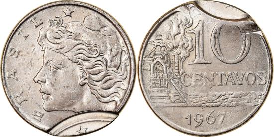 | | Coin, Brazil, 10 Centavos, 1967, Double struck, , Copper-nickel | | | Liberty head left, Oil refinery, denomination and date at right, error double struck, 2nd strike 85% off center (uniface, with indent) | | FEATURES |