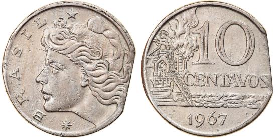 | | Coin, Brazil, 10 Centavos, 1967, Error straight clip, , Copper-nickel | | | Liberty head left, Oil refinery, denomination and date at right | | FEATURES |
