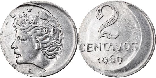 | | Coin, Brazil, 2 Centavos, 1969, error off center strike, , Stainless | | | Liberty head left, Denomination above date, off center strike + die clash, Thinner planchet. | | FEATURES |