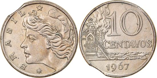 | | Coin, Brazil, 10 Centavos, 1967, error clipped planchet, | | | Liberty head left, Oil refinery, denomination and date at right | | FEATURES |