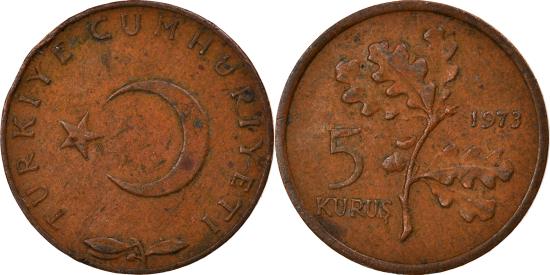 | | #[825853] COIN, TURKEY, 5 KURUS, 1973, , BRONZE, KM:890.2 | | | Crescent and star | | Oak branch divides value and date | | Reduced weight. | | CHARACTERISTICS |
