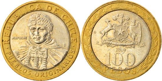 | | Coin, Chile, 100 Pesos, 2009, Santiago, , Bi-Metallic, KM:236 | | | Bust of native Mapuche girl facing, National arms above denomination, REPUBLICA DE CHILE - PUEBLOS ORIGINARIOS | | FEATURES |