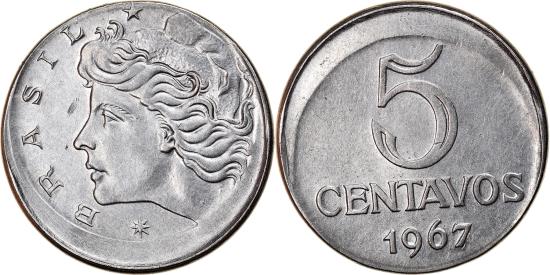 | | Coin, Brazil, 5 Centavos, 1967, error off center strike, , Stainless | | | Liberty head left, Denomination above date | | FEATURES |