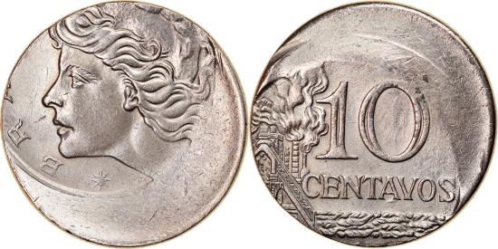 | | Coin, Brazil, 10 Centavos, cupped off center strike error, | | | Liberty head left, Oil refinery, denomination and date at right | | FEATURES |