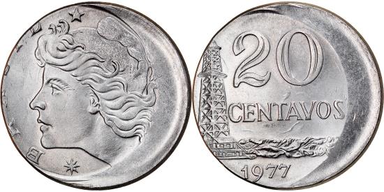 | | Coin, Brazil, 20 Centavos, 1977, error off center strike, , Stainless | | | Liberty head left, Denomination above date, oil derrick at left | | FEATURES |