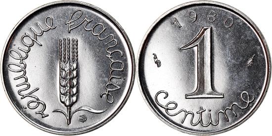 | | Coin, France, Épi, Centime, 1980, Paris, , Stainless Steel, KM:928 | | | Épi, Cursive legend surrounds grain sprig, Cursive denomination, date at top, 1991-1993 dated coins, non-Proof, exist in both coin and medal alignment. Values given here are for medal alignment examples. Pieces struck in coin alignment have been traded for as much as $50.00. | | FEATURES |