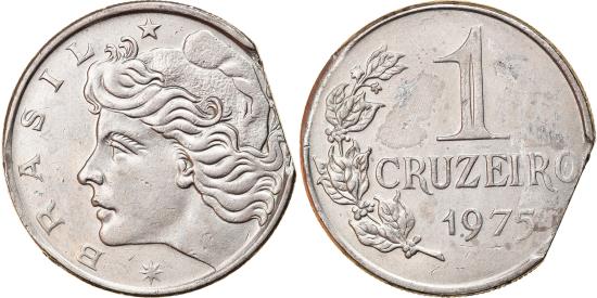 | | Coin, Brazil, Cruzeiro, 1975, Error straight clip, , Copper-nickel | | | Liberty head left, Denomination above date, spray at left | | FEATURES |