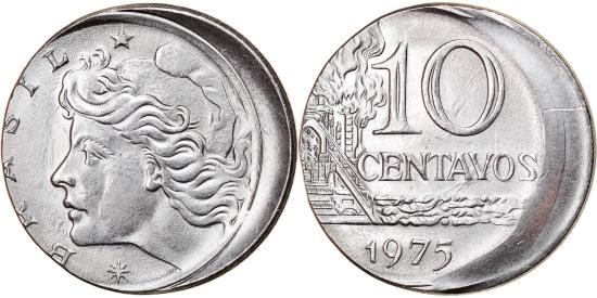 | | Coin, Brazil, 10 Centavos, 1975, error off center strike, , Stainless | | | Liberty head left, Oil refinery, denomination and date at right, off center strike with die clash | | FEATURES |