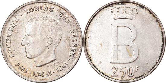 | | Coin, Belgium, 250 Francs, 250 Frank, 1976, Brussels, , Silver | | | Head of Baudouin left, legend in Dutch, Crowned large B, denomination below, Mint mark - Angel head. Mintmaster Vogeleer's privy mark - Bird., KONING DER BELGEN | | FEATURES |
