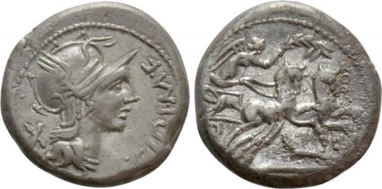 Obv: M CIPI M F. Helmeted head of Roma right; X (mark of value) to left. Rev: ROMA. Victory driving galloping biga right, holding reins and palm frond; rudder below.