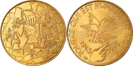 | | France, Secours Populaire, Jeton Souvenir, 1995, Pessac, , Bronze | | | Secours Populaire Français 1945 - 1995, Main ailée ouverte au centre Tout Ce Qui Est Humain Est Notre Secours Populaire Francais 1945-1995, Visage d'homme dans un cadre entouré de 3 mains | | FEATURES |
